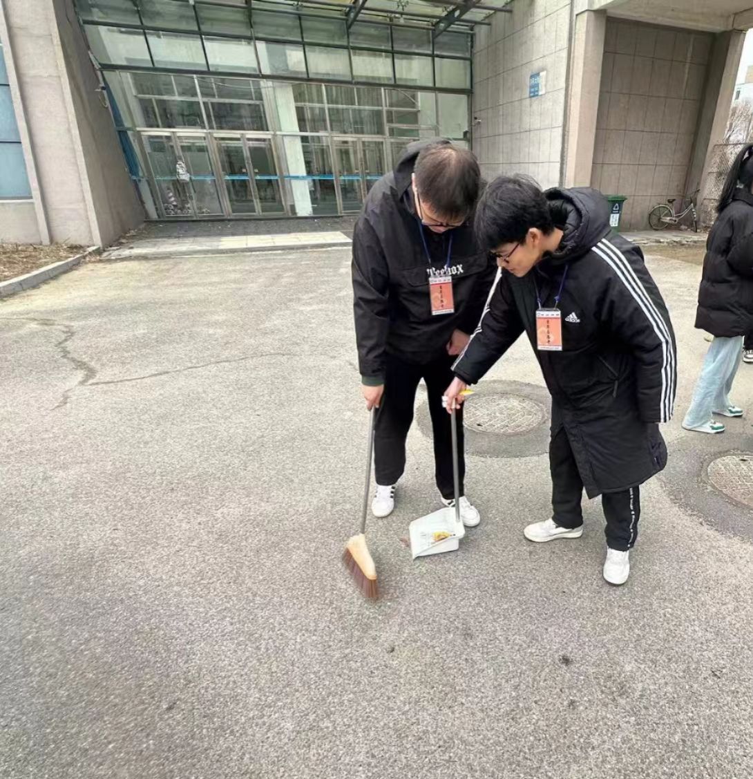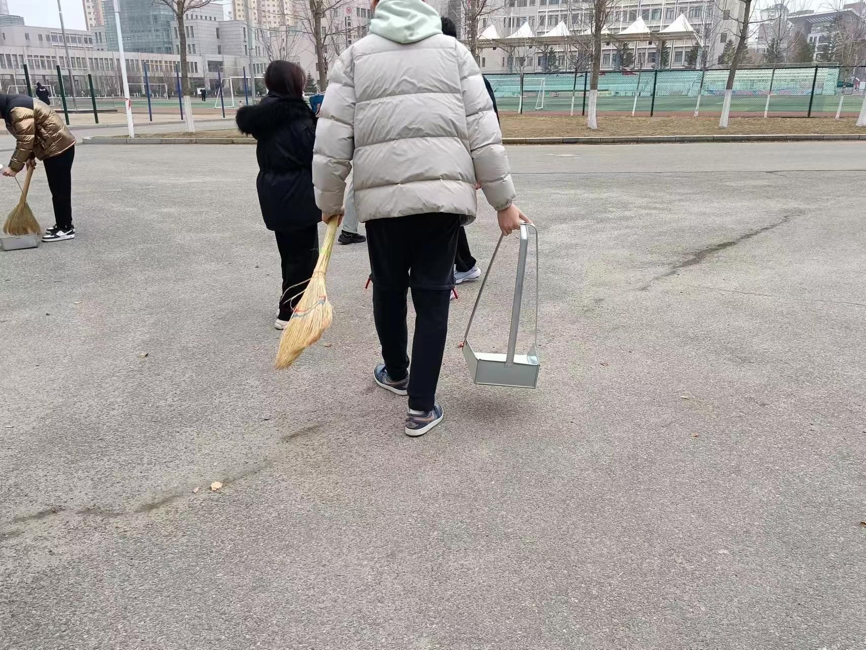 为确保清洁活动顺利有序地开展,在活动正式开始前,部长将志愿者分为两个小组,分别负责地面及草坪的清扫工作,随后,由小组组长分发好卫生工具,在各组长的带领下两个小组的志愿者们各司其职,认真地清扫体育馆门前的各种垃圾。尽管天气很冷,但志愿者们的工作积极性却丝毫未减,活动进展得有条不紊。大约中午12时,清洁活动基本结束,由组长收好卫生工具志愿者们将收集的垃圾统一倒入垃圾桶内,活动结束后,志愿者们进行合照留念。