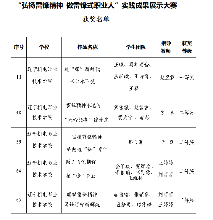 5月11日,辽宁省高职高专院校“弘扬雷锋精神 做雷锋式职业人”大思政实践教学成果展示汇报活动获奖结果揭晓,由我校推荐的5名学生作品全部获奖。